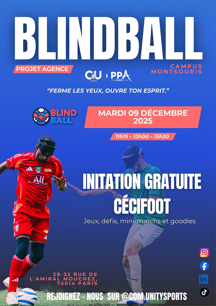 Cette idée guide l’un de nos ateliers phares. En effet, nous proposons des ateliers de cécifoot revisités, organisés directement sur le campus. Durant ces sessions, les étudiants jouent les yeux bandés. Grâce à ce format, ils vivent une immersion totale dans la peau d’un sportif non-voyant.